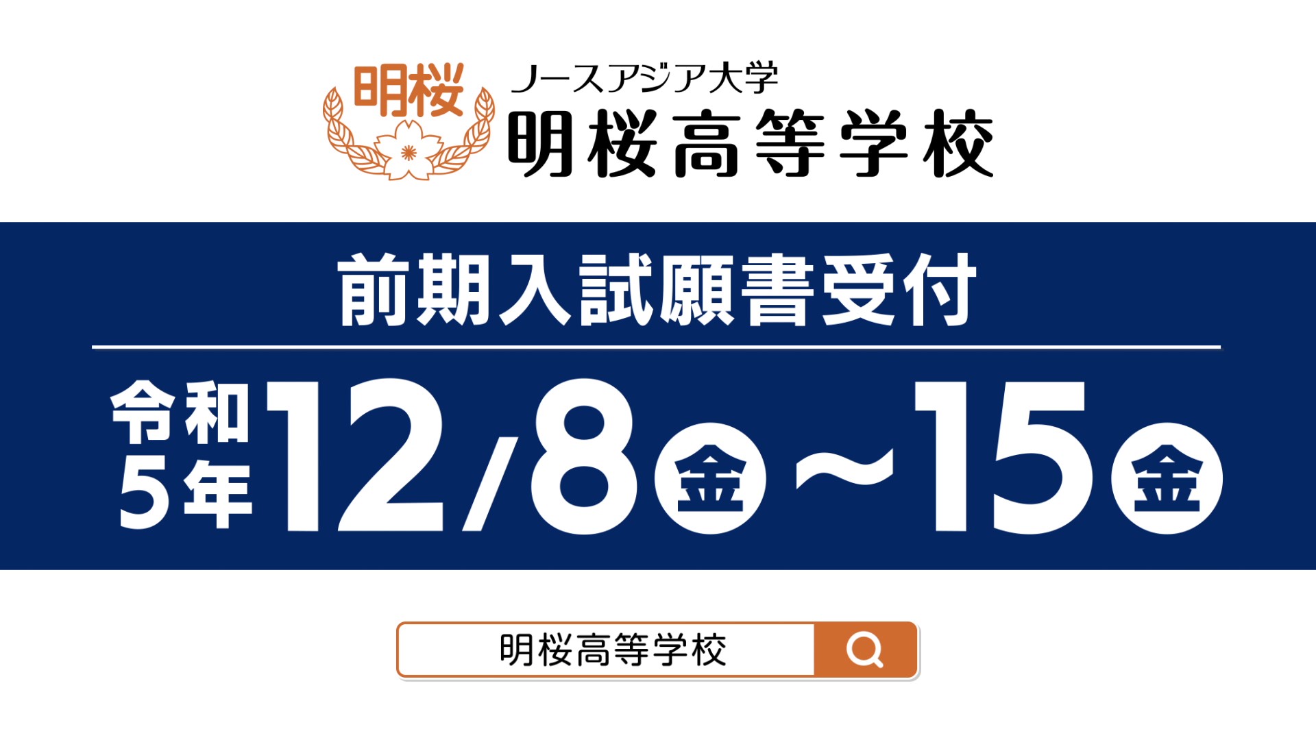 Loading... 在校生の皆様へ 動画ライブラリ ニュースNEWS 新着情報 新着情報 2025年12月12日(金) Today’s MEIOH 12月12日更新しました 新着情報 2025年12月1日(月) 前期入試(1/7)WEB出願開始【12/1~12/12】 新着情報 2025年11月5日(水) 令和8年度 人間科学コース(通信制課程)の設置について 新着情報 2025年10月6日(月) 令和8年度 入試要項・出願書類 新着情報 2025年8月21日(木) 令和7年度 第2回オープンスクール(9/25)開催! トピックス トピックス 2025年12月10日(水) [動画] 一般入試2026(2/4) トピックス 2025年10月6日(月) 学校見学会の実施について トピックス 2025年9月29日(月) 「第73回全日本吹奏楽コンクール出場に係る募金」ご協力のお願い トピックス 2025年8月25日(月) [動画] 令和7年度 運動会&フレンドシップ トピックス 2025年7月28日(月) [動画] 令和7年度 第1回オープンスクール(8/16) ニュース一覧を見る TODAY'S MEIOH今日の明桜高校 12月12日(金) 本日は女子サッカー部へ訪問しました。29日から兵庫県で行われる第34回全日本高等学校女子サッカー選手権大会にむけて、パス回しや体を張った守り・・・ 12月11日(木) 本日は3年デジタルコースの情報Ⅱへ訪問しました。プログラミングの実践をテーマに、ロボットに動き方をプログラムさせていました。その後クラスで発・・・ 12月10日(水) 本日は3年特別進学コースの数学Cへ訪問しました。1ヶ月後に迫る大学入学共通テストに向けて、問題演習を行っていました。生徒は今までの学習内容を・・・ 過去の記事一覧を見る MEIOH MOVIES明桜高校 動画ライブラリ 学校紹介動画 一般入試2026(2/4) 令和7年度 運動会&フレンドシップ 令和7年度 第1回オープンスクール(8/16) 学校紹介動画へ コース紹介COURSE 特別進学コースα 詳しく見る 特別進学コースβ 詳しく見る デジタルコース 詳しく見る 文理コース 詳しく見る 総合研究コース 詳しく見る 学校生活SCHOOL LIFE 年間行事予定 部活動 国際交流 在校生の皆様へ 証明書発行 スクールバス時刻表 入試情報ADMISSION 学校案内2026 WEB出願・入試要項・出願書類 交通アクセスACCESS 〒010-8525 秋田県秋田市下北手桜守沢8-1 スクールバス(学生、生徒、教職員向け) 秋田駅東口から無料のスクールバスが 出ています。/所要時間約10分。 スクールバス 運行予定表はこちらから 秋田駅東口からタクシーで約10分。 LINKリンク 強化部ホームページ 関連サイトリンク