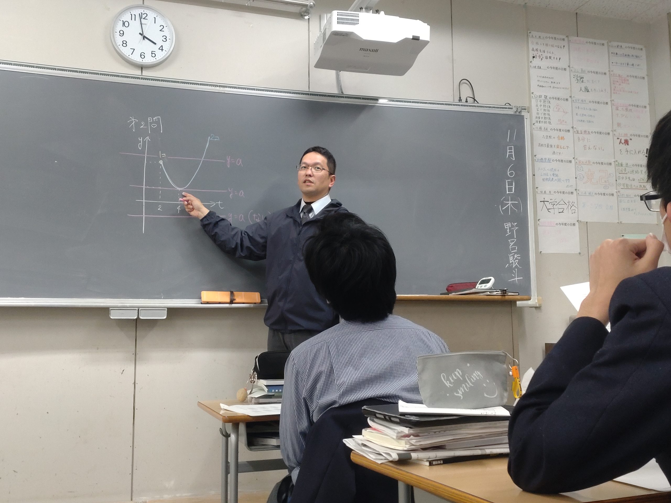 本日は3年特別進学コースの数学精選へ訪問しました。大学入学共通テストを想定した実践形式の問題を解いたのち、担当教員による解説を聞いていました。解法のポイントをまとめて、忘れないうちに復習をしましょう!