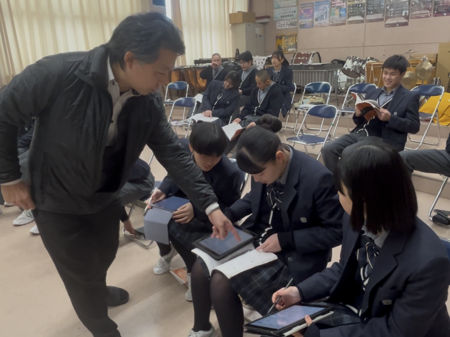 本日は、1年総合研究コースの音楽Ⅰへ訪問しました。生徒は、音符や休符の種類について理解を深め、4分の2拍子に合わせて作成したリズムが正しいかどうかを確認し合っていました。楽譜が読めるようになると、音楽の世界をさらに楽しめますね!