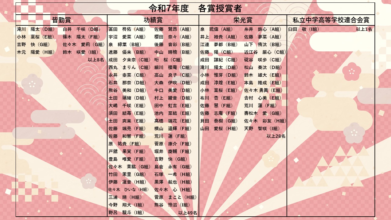 本日は各賞授賞式・記念品贈呈式を実施しました。3年間で積み重ねてきた成果の中で、特に輝かしい活躍をした生徒に贈られます。授賞された皆さん、おめでとうございます!明後日はいよいよ卒業証書授与式です。明桜高校での思い出を懐かしみながら、晴れ姿を披露してください!