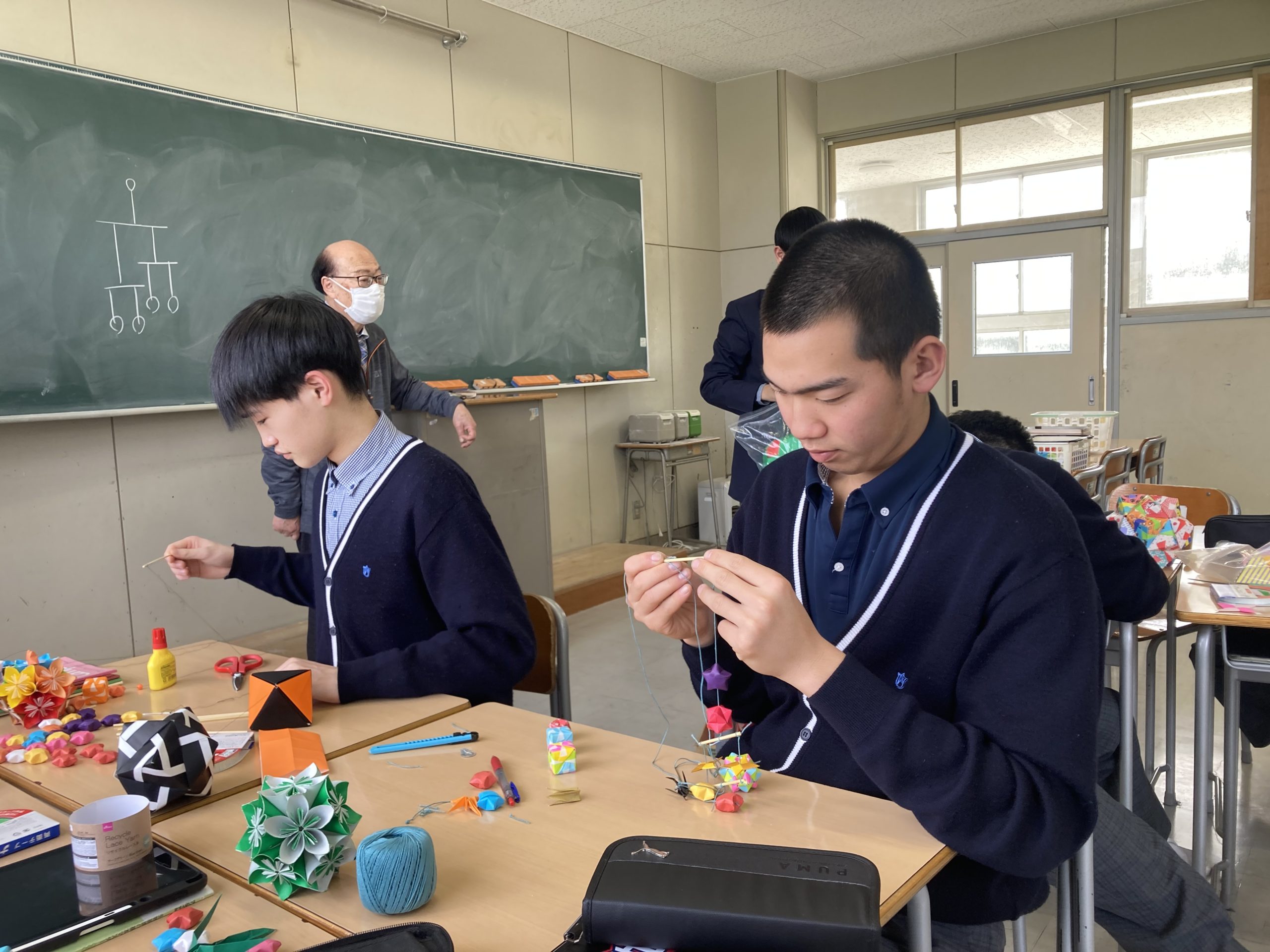本日は、2年生総合研究コースの数理研究へ訪問しました。生徒は、折り紙を使ったモビール制作に挑戦していました。吊り下げる物の重量を変えたり、支点の場所を微調整しながら、バランスよく水平を保つポイントを探していました。机上の計算だけでなく、実際に物体を動かして図形や重心を学習するおもしろい授業でしたね!